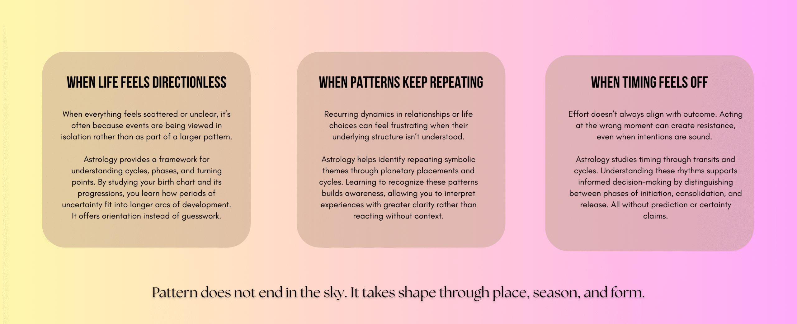 Astrology is a language of time, pattern, and symbol. A birth chart captures a moment in time and place, expressed through planetary positions and cycles. Learning to read that chart is a process of study, observation, and interpretation.