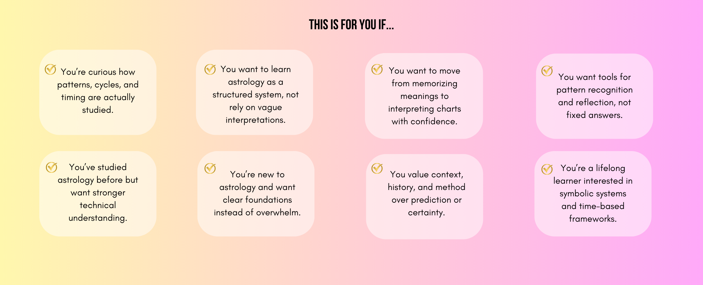 Astrology can feel complex without structure. AstroFluent is designed to make astrology learnable by breaking it into clear components: symbols, relationships, cycles, and timing. Fluency develops through method, not memorization.
